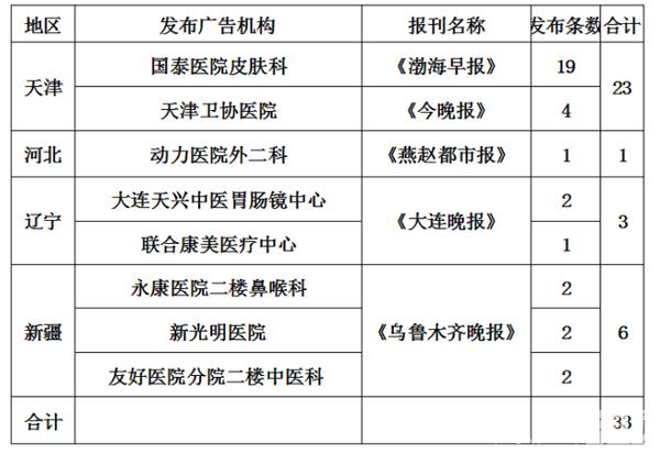 其中天津發(fā)布虛假違法中醫(yī)醫(yī)療廣告情況較為嚴(yán)重,國泰醫(yī)院皮膚科在《渤海早報(bào)》發(fā)布19條次,天津衛(wèi)協(xié)醫(yī)院在《今晚報(bào)》發(fā)布4條次。河北省的動力醫(yī)院外二科在《燕趙都市報(bào)》發(fā)布1條次。遼寧省的大連天興中醫(yī)胃腸鏡中心和聯(lián)合康美醫(yī)療中心在《大連晚報(bào)》分別發(fā)布2條次、1條次。新疆維吾爾自治區(qū)的永康醫(yī)院二樓鼻喉科、新光明醫(yī)院、友好醫(yī)院分院二樓中醫(yī)科在《烏魯木齊晚報(bào)》各發(fā)布2條次。具體名單見下: